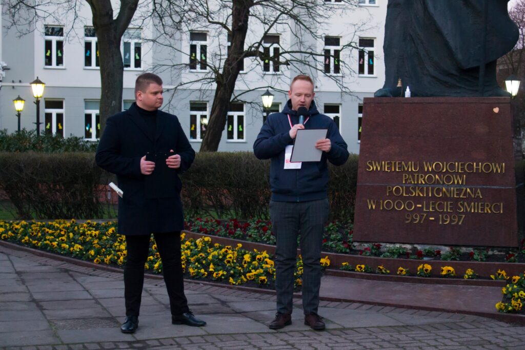 -Zamach na jego życie nie powiódł się, bo jak sam Jan Paweł II powiedział: „Tamtego popołudnia czyjaś ręka strzelała, inna prowadziła kulę…”. Dziś, po 18 latach od czasu, gdy odszedł do Domu Ojca, strzela się do niego znowu. Po słowach wstępu Jakuba Wawrzyniaka, Patryk Frąckowiak przeczytał tekst uchwały Rady Miasta Gniezna z dnia 29 sierpnia 2003r. nadającą Jego Świętobliwości Papieżowi Janowi Pawłowi II Honorowe Obywatelstwo Miasta Gniezna.