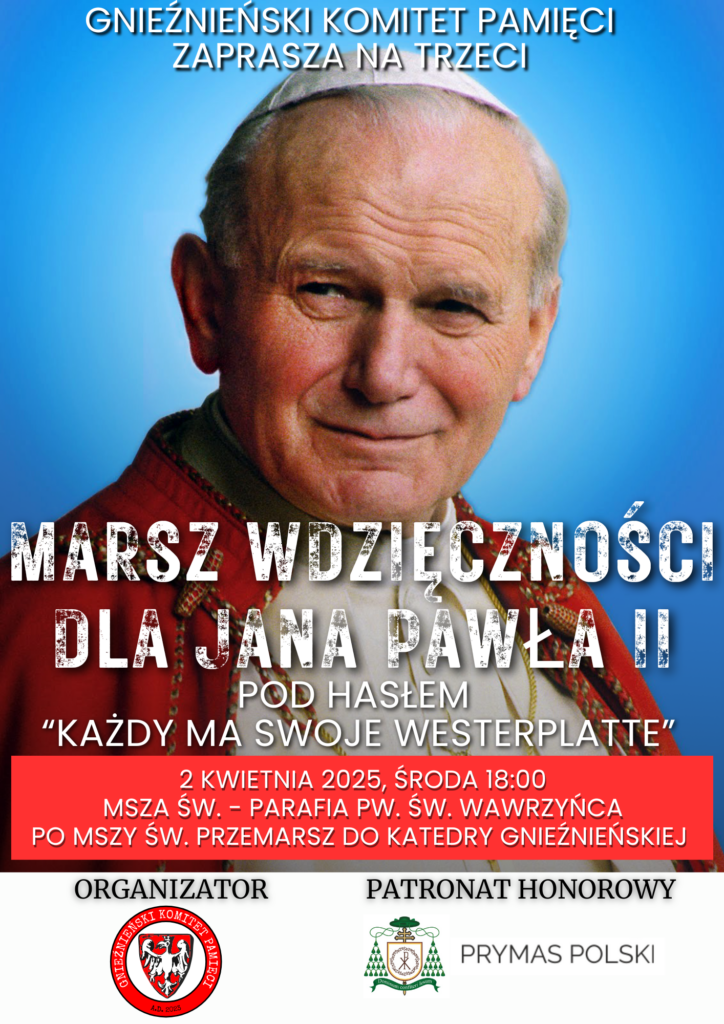 Gnieźnieński Komitet Pamięci zaprasza 2 kwietnia na Mszę świętą oraz Marsz Wdzięczności dla św. Jana Pawła II pod hasłem: „Każdy ma swoje Westerplatte „. W dwudziestą rocznicę Jego przejścia do Domu Ojca, w kościele pw. św. Wawrzyńca zostanie odprawiona o godzinie 18.00 Msza Święta dziękczynna w kościele pw. Św. Wawrzyńca w Gnieźnie i zaraz po nie wyruszy III Marsz Wdzięczności. Przejdzie on ulicami Starego Miasta do katedry i zakończy się modlitwą u relikwii świętego papieża. Wydarzenie objął swym patronatem honorowym prymas Polski, ks. abp Wojciech Polak.